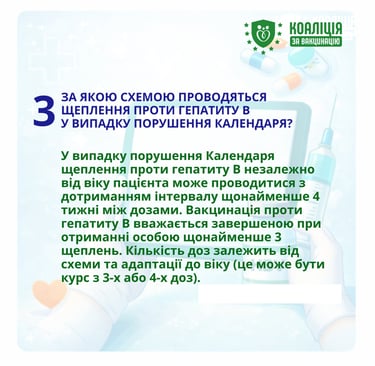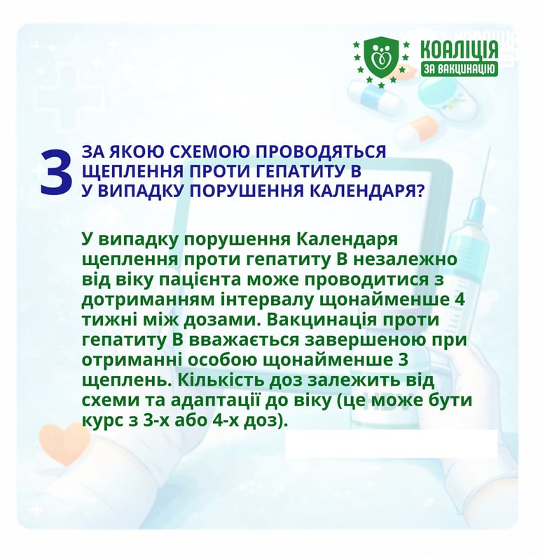 Відповідь: У випадку порушення Календаря щеплення проти гепатиту В незалежно від віку пацієнта може проводитися з дотриманням інтервалу щонайменше 4 тижні між дозами. Вакцинація проти гепатиту B вважається завершеною при отриманні особою щонайменше 3 щеплень. Кількість доз залежить від схеми та адаптації до віку (це може бути курс з 3-х або 4-х доз).