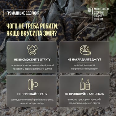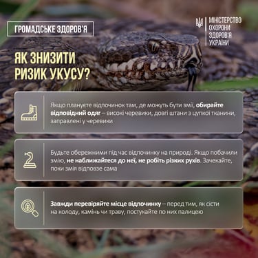 Сьогодні розповімо, як знизити ризик укусу та як надати першу медичну допомогу, якщо вас або ваших близьких вкусила змія.