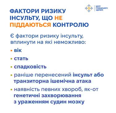 Є фактори ризику інсульту, вплинути на які неможливо, — це вік, стать, спадковість, раніше перенесений інсульт або транзиторна ішемічна атака, наявність певних хвороб, як-от генетичні захворювання з ураженням судин мозку.