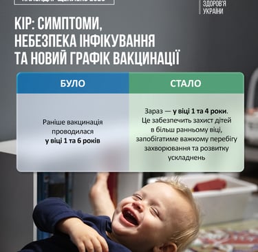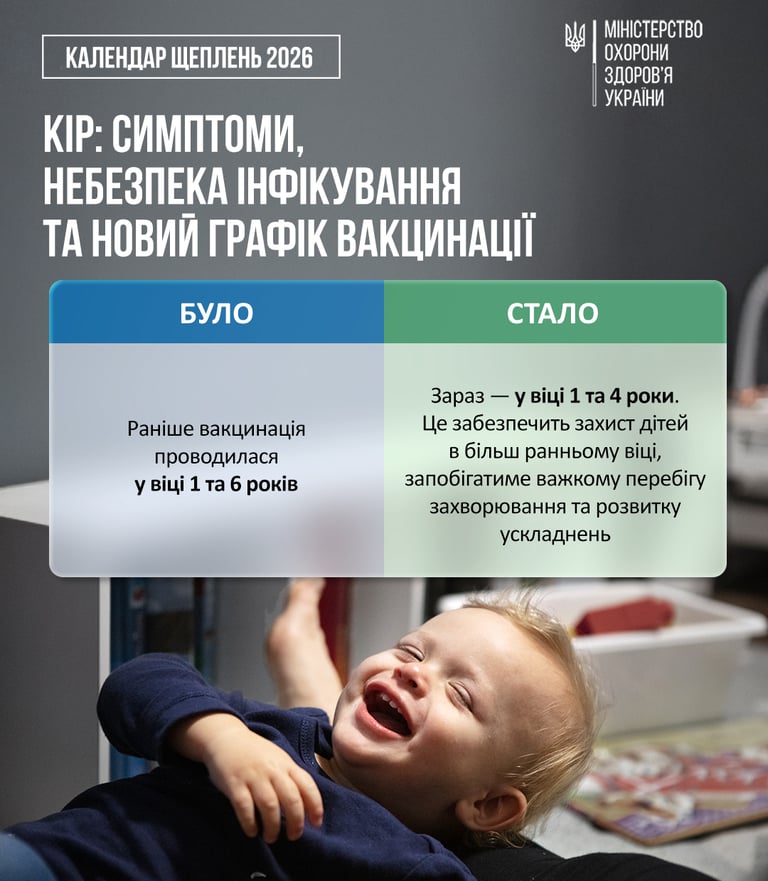 За оновленим Національним календарем профілактичних щеплень, щеплення проти кору проводиться разом зі з щепленням проти епідемічного паротиту та краснухи у віці 1 та 4 років комбінованою вакциною КПК. Це гарантує надійний захист у більш ранньому віці — ще у дитячому садку.
