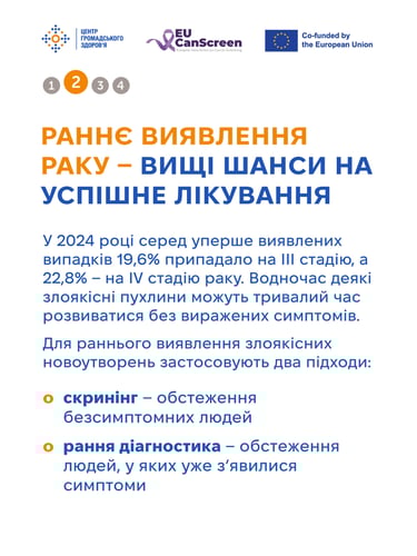 Для раннього виявлення злоякісних новоутворень застосовують два підходи: скринінг і ранню діагностику.