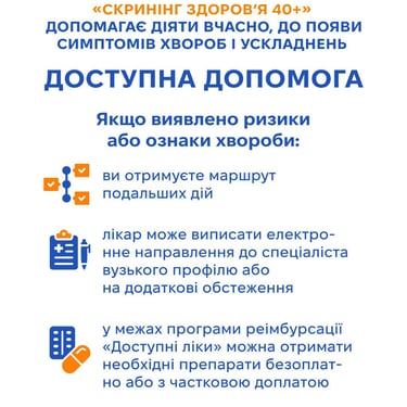 Нагадуємо, що з 2026 року кожен українець і кожна українка віком 40+ зможе щороку пройти безоплатний скринінг у зручному закладі за програмою «Скринінг здоров’я 40+». Запрошення пройти скринінг надходить автоматично через застосунок Дія — на 30-й день після дня народження всім людям, яким виповнилося 40 років або більше.