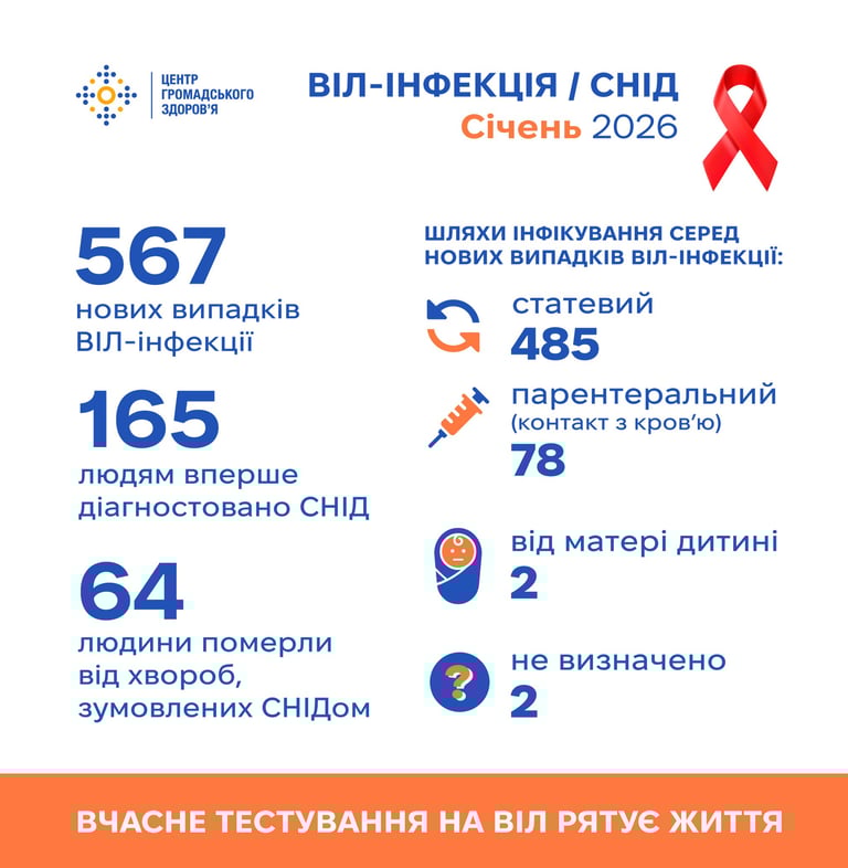 У січні 2026 року в Україні офіційно зареєстровано 567 нових випадків ВІЛ-інфекції, у 155 пацієнтів вперше діагностовано СНІД, 64 людини померли від хвороб, зумовлених СНІДом.