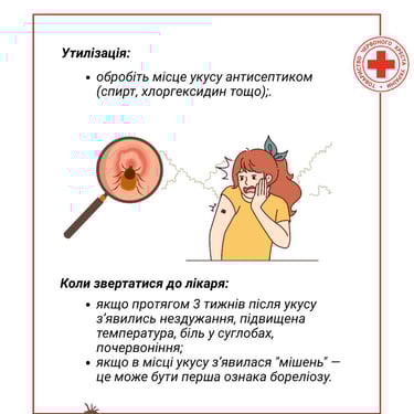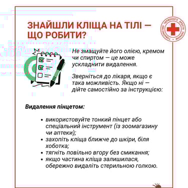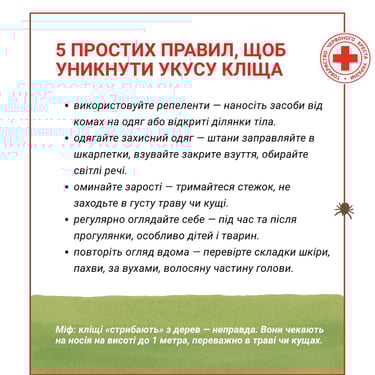 Щоб зменшити ризики для власного здоров’я, важливо дотримуватись простих правил профілактики та знати, як діяти у разі виявлення кліща. Перевірте, чи все вам знайомо.
