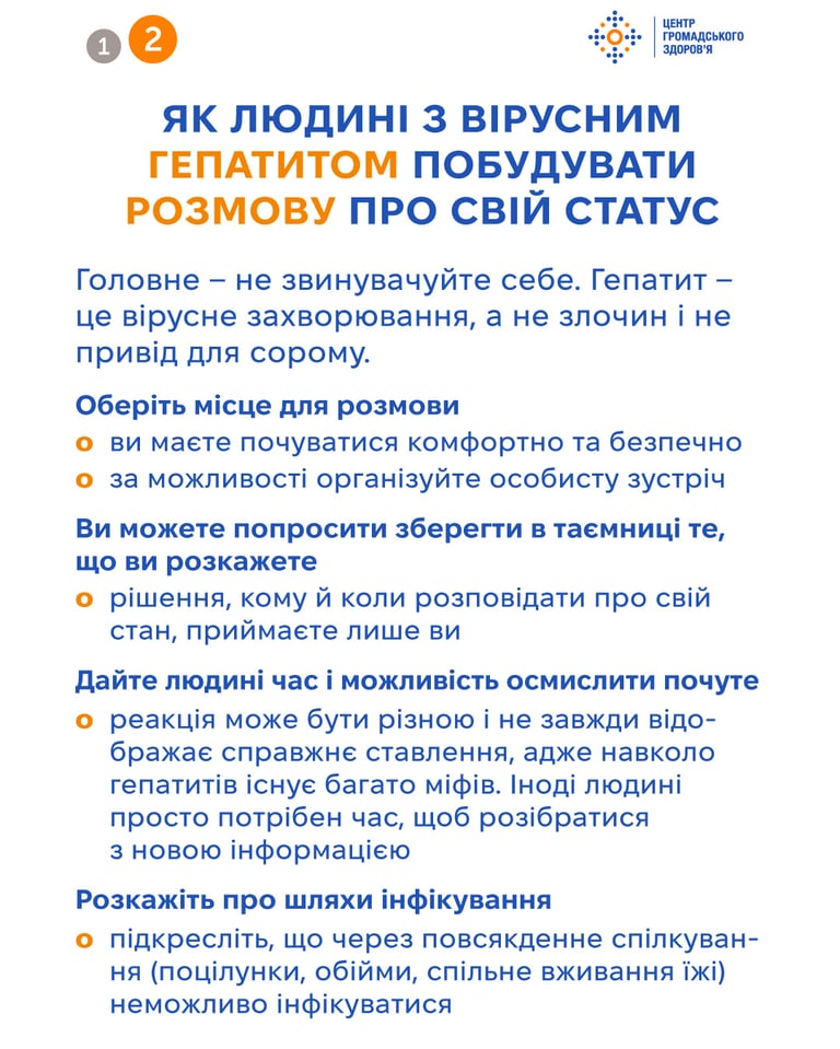 І пам'ятайте, що повідомлення про хворобу або ризик інфікування нею — це питання безпеки інших людей та можливість отримати послуги ранньої діагностики ВГ, та, за потреби, вчасного початку лікування ВГ, що зменшить імовірність розвитку ускладнень, таких як цироз чи гепатоцелюлярна карцинома (первинний рак печінки).